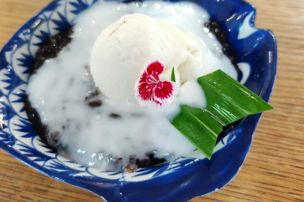 และแล้วนางเอกของวันนี้ก็มาเสิร์ฟค่ะ เมนูแรกคือ ติม-โปะ-เปียก แค่ชื่อก็เก๋แล้ว! เมนูนี้คือการนำเอา เปียกข้าวเหนียวดำ ที่ให้รสชาติหวานหอมแบบดั้งเดิม มาโปะด้วยน้ำกะทิเข้มข้นหอมมัน ที่มีรสเค็มนิดๆ มาช่วยตัดรสหวานได้อย่างลงตัว และที่ขาดไม่ได้คือการเสิร์ฟคู่กับ ไอศกรีมกะทิโฮมเมด เย็นฉ่ำ ที่เพิ่มความครีมมี่และลงตัวให้กับรสชาติแบบไทยๆ ในรูปแบบที่เย็นสดชื่น เป็นการผสมผสานรสชาติที่คุ้นเคยในมิติใหม่ที่น่าทึ่งมากๆ ค่ะ