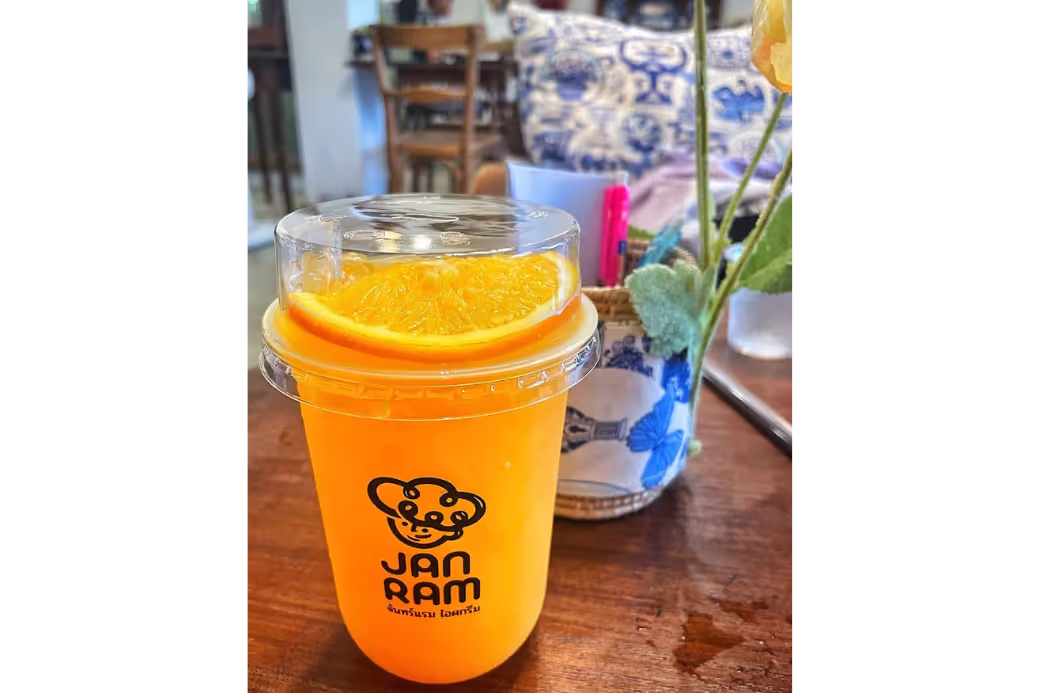 ฉันเลือกที่นั่งตรงมุมติดหน้าต่าง แล้วเริ่มพิจารณาเมนูอย่างตั้งใจ เพราะรู้มาว่าที่นี่ไม่ได้ขายไอศกรีมทั่วไป แต่เป็นการนำขนมไทยดั้งเดิมมาแต่งงานกับไอศกรีมซันเดย์สไตล์โมเดิร์น! วันนี้ฉันสั่งเมนูที่ได้รับคำแนะนำมา เริ่มจากเครื่องดื่มเย็นๆ อย่าง น้ำส้มคั้น ที่รสชาติสดชื่น เปรี้ยวอมหวาน ทำให้ร่างกายตื่นตัวขึ้นมาทันที