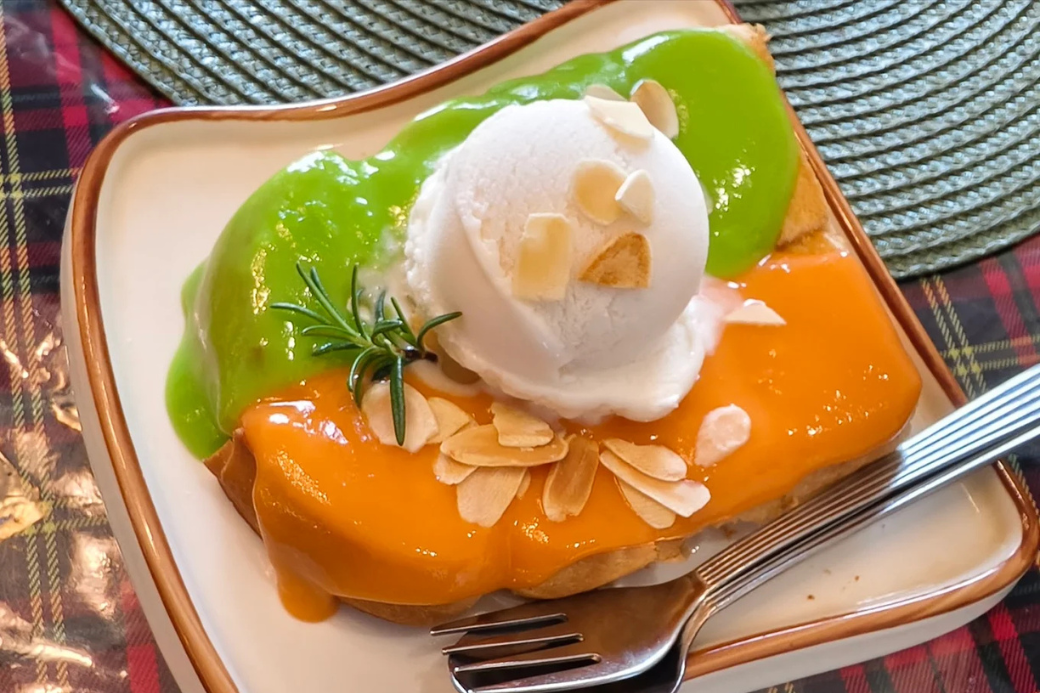 อีกเมนูที่สั่งมาแบ่งกันฟินคือ ปังปิ้งสังขยาทูโทน ขนมปังปิ้งมาแบบกรอบนอกนุ่มใน หอมกรุ่น เสิร์ฟพร้อมสังขยา 2 รสชาติ คือ สังขยาใบเตย สีเขียวนวล และ สังขยาวานิลา สีเหลืองอ่อนๆ ซึ่งรสชาติหวานหอมกำลังดี เมื่อทานคู่กับ ไอศกรีมกะทิ เย็นฉ่ำแล้วยิ่งอร่อยลงตัวค่ะ เป็นการยกระดับของหวานคลาสสิกให้โมเดิร์นขึ้นมาอีกขั้น
