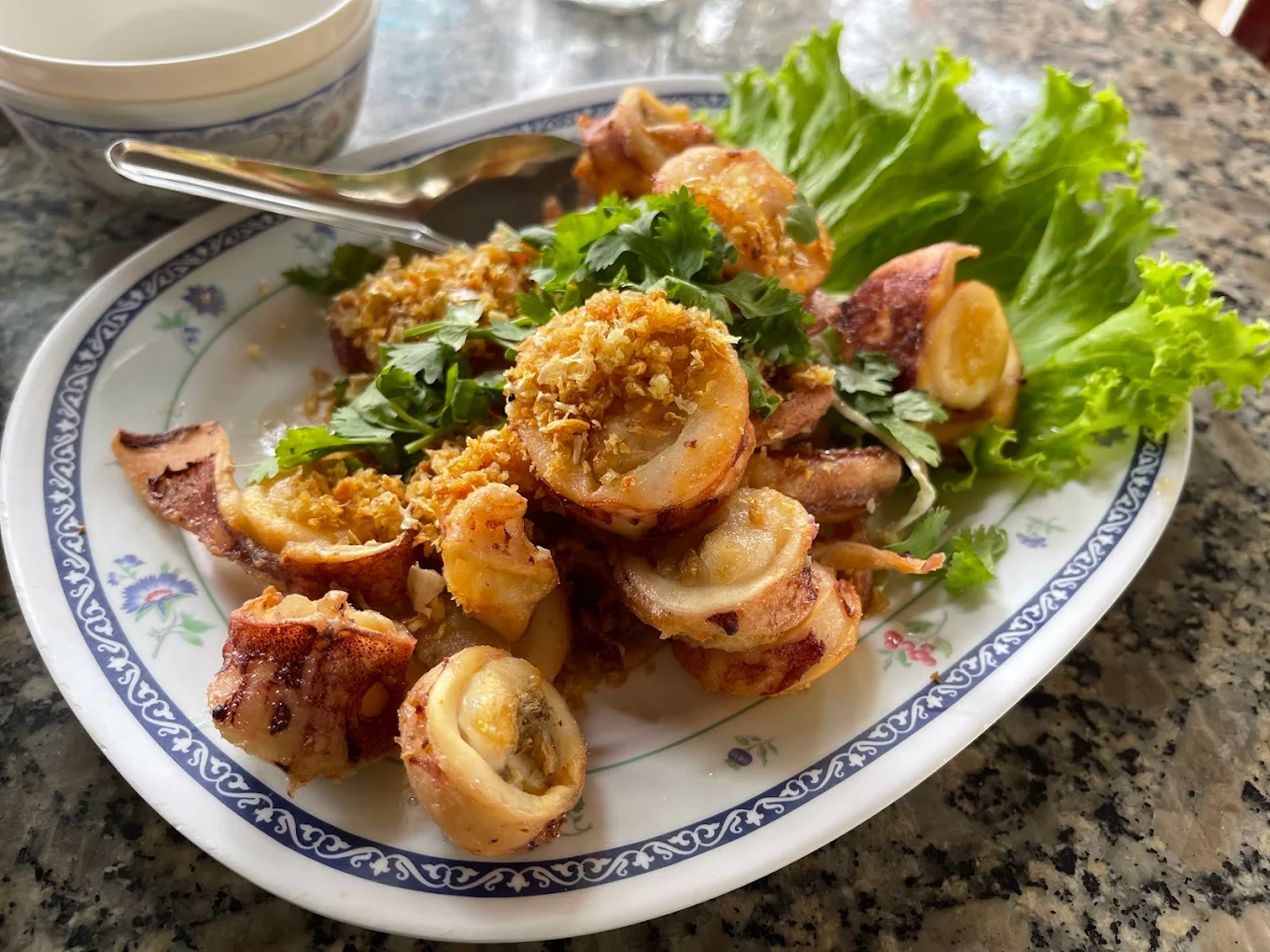 ต่อด้วย หมึกทอดกระเทียม จานนี้ทำได้ดีเกินคาดค่ะ หมึก สดกรอบ ไม่เหนียว ทอดมากับกระเทียมเจียวแบบหอม ๆ ฟู ๆ รสชาติเค็ม ๆ มัน ๆ หอมกระเทียมเจียวเต็ม ๆ คำ เป็นกับข้าวที่อร่อยลงตัวมาก ๆ ค่ะ
