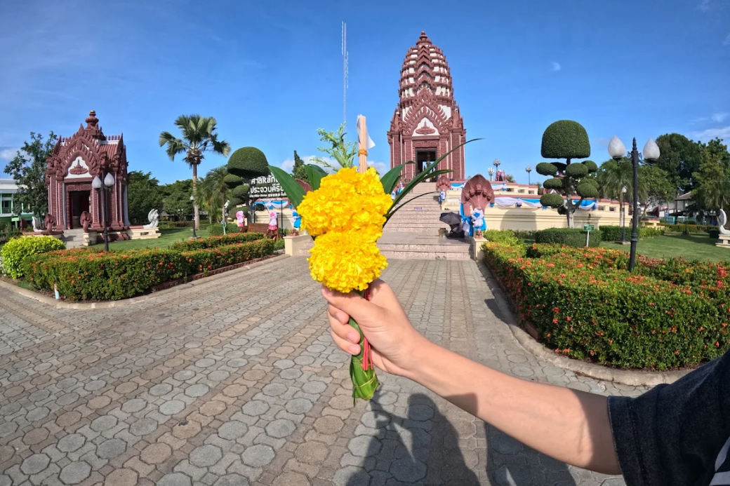 จุ๊เดินไปที่จุดจำหน่ายดอกไม้ ธูปเทียน และแผ่นทองทำบุญค่ะ (ที่นี่ไม่มีจัดชุดไหว้นะคะ เราสามารถทำบุญได้ตามกำลังศรัทธาเลย)