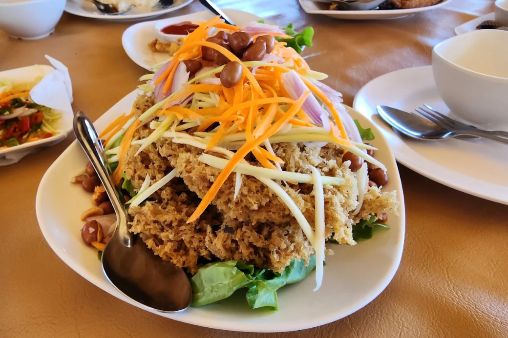 ตามมาด้วยเมนูที่ขาดไม่ได้อย่าง ยำปลาทูฟู ปลาทูของที่นี่เขาทำได้ฟูจริง ๆ ค่ะ! กรอบเบาเหมือนปุยเมฆ ทานคู่กับน้ำยำมะม่วงรสเปรี้ยวหวานที่ปรุงมาอย่างกลมกล่อม มีถั่วกรอบ ๆ ตัดรส เป็นจานที่ทุกคนตักแย่งกันอย่างสนุกสนาน