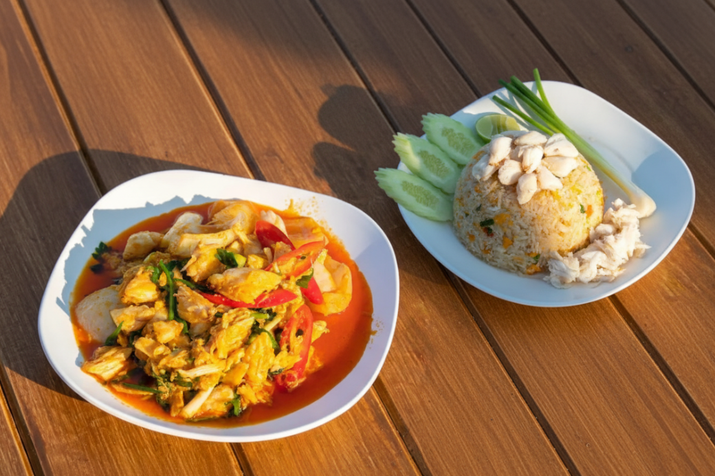 เมนูจานหลักที่เอาไว้คลุกข้าวก็คือ ปูม้าผัดผงกะหรี่ กับ ข้าวผัดปู ค่ะ ปูม้าเนื้อแน่น ๆ ผัดกับซอสผงกะหรี่ที่หอมเข้มข้น หวานมันกำลังดี ส่วนข้าวผัดปูก็ผัดมาแบบแห้ง ๆ หอมกลิ่นกระทะ มีเนื้อปูให้ตักเจอแบบไม่ต้องส่อง สองจานนี้กลายเป็นเมนูโปรดของเด็ก ๆ ไปโดยปริยาย
