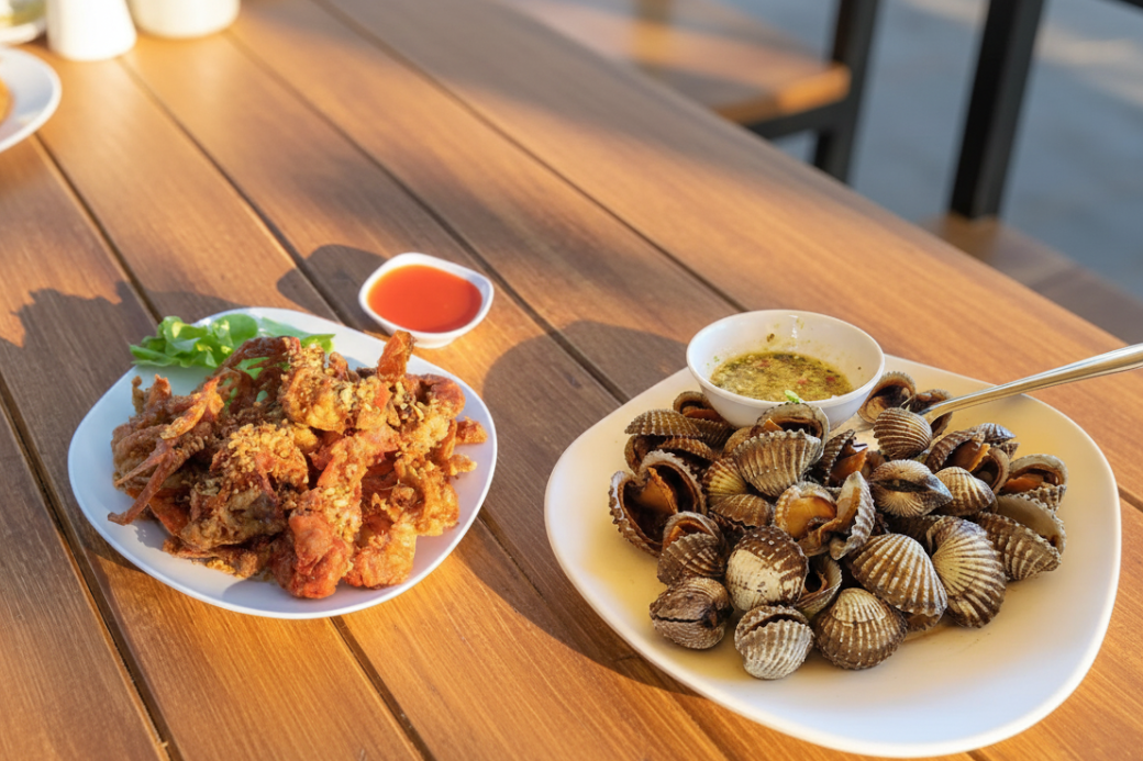 งานนี้ไม่ลืมสั่งเมนูโชว์ความสดอย่าง ปูนิ่มทอดกระเทียม และ หอยแครงลวก ปูนิ่มทอดมาได้กรอบแบบกินได้ทั้งตัว ไม่อมน้ำมันเลยค่ะ! ส่วนหอยแครงลวกก็ลวกมากำลังดี ยังมีความหวานฉ่ำของหอยอยู่ พอจิ้มกับ น้ำจิ้มซีฟู๊ดรสแซ่บ ของร้าน (ที่รสชาติเผ็ดสะใจกว่าน้ำจิ้มร้านอื่น) มันคือการรวมตัวของความอร่อยที่ลงตัวที่สุด!