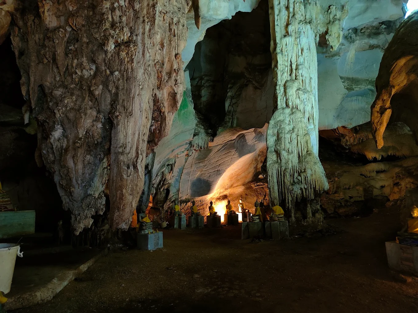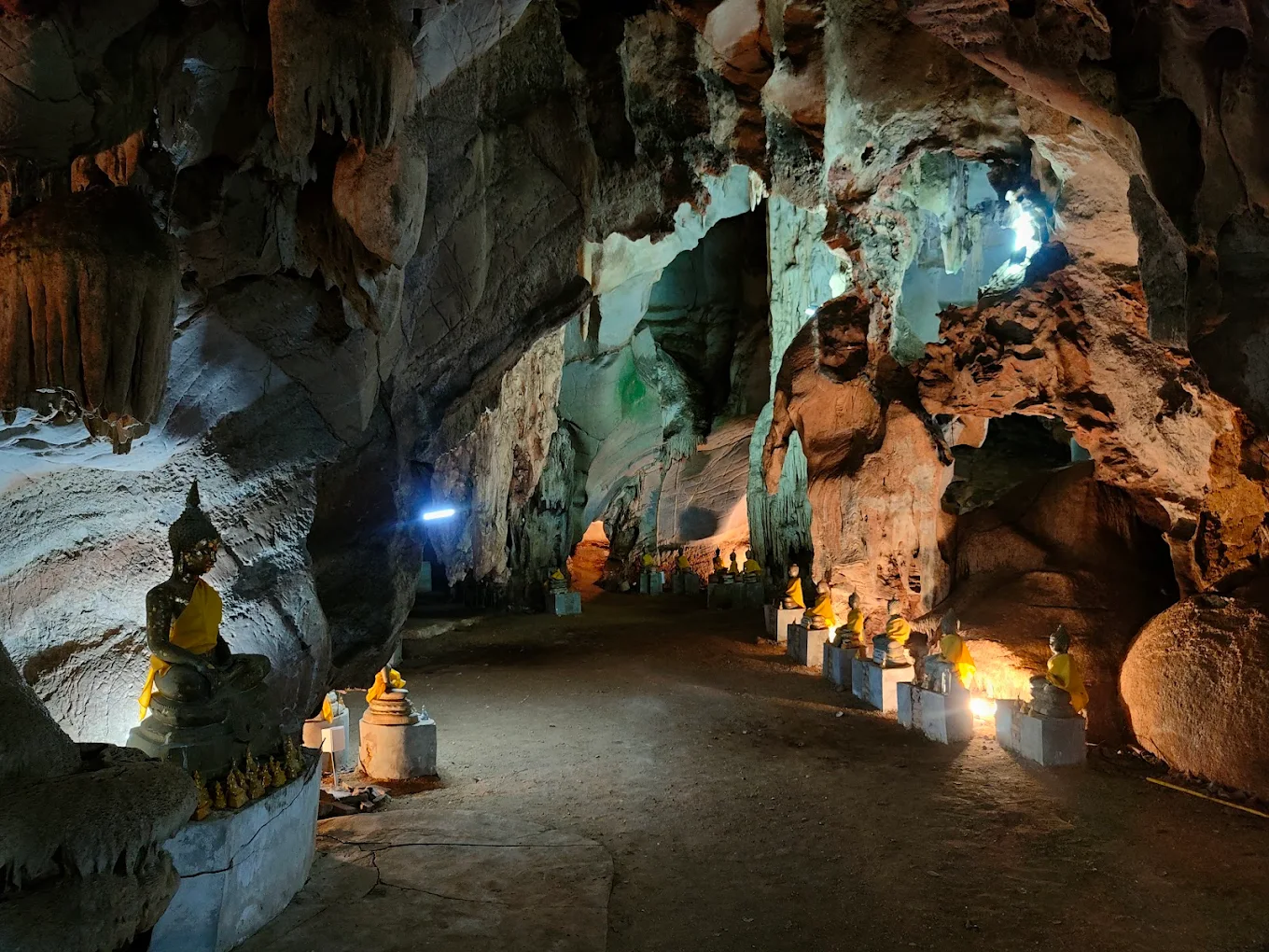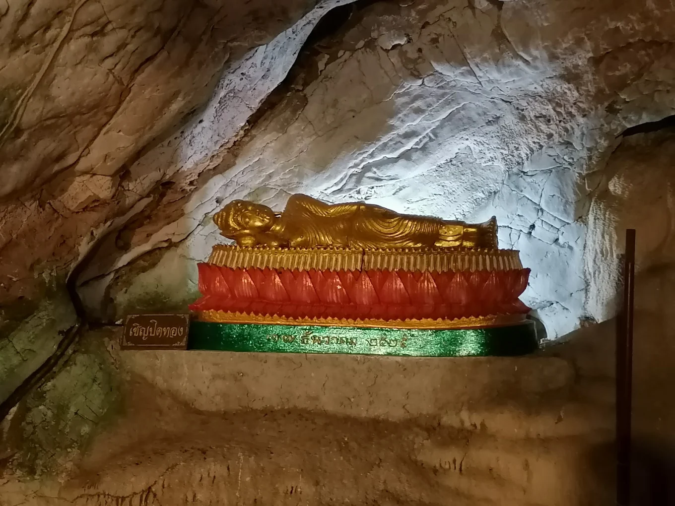 ทริปนี้ตั้งใจแวะมาไหว้พระทำบุญก่อนกลับ แต่พอมาถึงก็รู้สึกว้าวเลย! บรรยากาศด้านนอกวัดคือ สงบ ร่มรื่น มาก ๆ เหมาะกับการมาฮีลใจและพักสมองจากความวุ่นวายสุด ๆ แต่ไฮไลต์เด็ดที่ทำให้เราตื่นเต้นที่สุดคือการเดินเข้า ถ้ำขนาดใหญ่ ค่ะ! เหมือนเปิดประตูสู่โลกอีกใบ! ข้างในถ้ำคือเย็นสบาย มีแสงไฟส่องสว่างตลอดทาง เดินง่ายมาก ๆ (ไม่ต้องกลัวลื่นเลยค่ะ) ถือว่าสะดวกสบายสำหรับนักท่องเที่ยวอย่างเราสุด ๆ เลย!