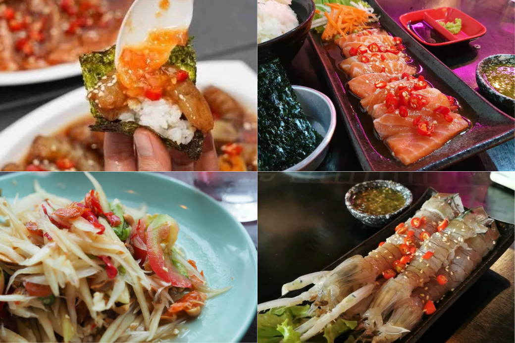 มุมเครื่องเคียง: ถ่ายภาพรวมเมนูที่เราสั่ง ที่เต็มไปด้วยสีแดงของพริก สีเขียวของผักชีและมะนาว เพื่อแสดงถึงความ แซ่บจัดจ้าน สไตล์ไทย