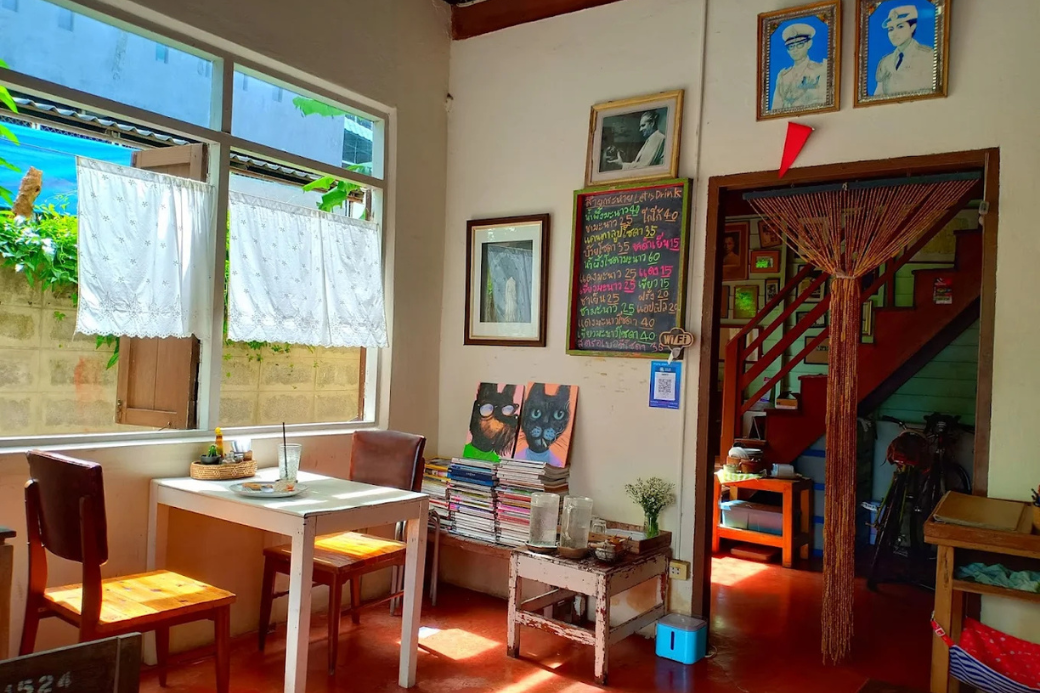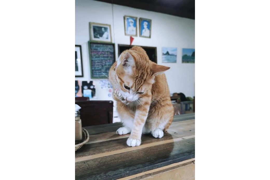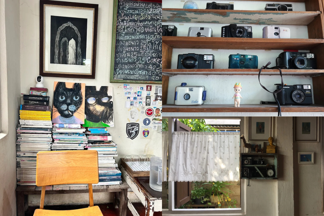 พอเดินเข้ามาในร้านเท่านั้นแหละ ก็รู้สึกเหมือนหลุดเข้าไปในห้องเก็บของสุดวินเทจของใครสักคนเลยค่ะ การตกแต่งที่นี่คือดีเทลแน่นมาก มีทั้งโซนที่เต็มไปด้วย กล้องเก่า ๆ หนังสือเก่า ๆ ที่วางเรียงรายอยู่ แถมยังมี รูปภาพน้องแมวเก๋ ๆ ประดับตามผนังอีกเพียบ! โต๊ะเก้าอี้ที่ใช้ในร้านก็เป็นงานไม้สไตล์วินเทจทั้งหมด บอกเลยว่าทาสแมวแบบฉันนี่ใจฟูมาก ๆ เพราะที่นี่มีน้องแมวตัวจริงเสียงจริงเดินไปเดินมาให้เห็นอยู่บ้างด้วยค่ะ (แต่ก็แล้วแต่วันและแล้วแต่น้อง ๆ นะคะ ว่าจะออกมาต้อนรับแขกรึเปล่า)