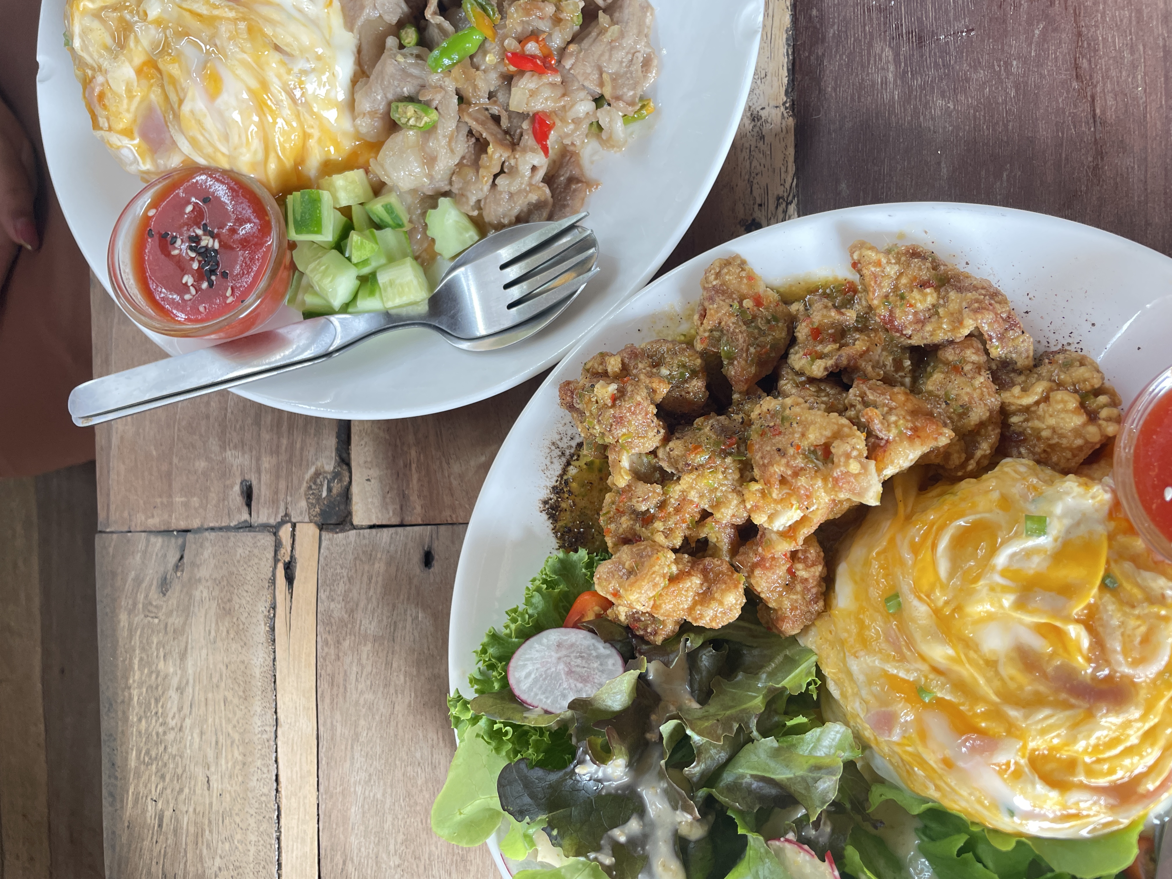 วันนี้ฉันกับเพื่อนสั่งมาลองสองจานที่หน้าตาน่ากินสุด ๆ จานแรกคือ ข้าวไก่ทอดคลุกฝุ่น + ไข่ข้น + สลัด ส่วนอีกจานคือ ข้าวหมูผัดพริกสด + ไข่ข้น พออาหารมาเสิร์ฟเท่านั้นแหละก็รู้เลยว่าคำเตือนเรื่องปริมาณไม่ใช่เรื่องล้อเล่น! เพราะทั้งสองจานคือให้เยอะมากจริง ๆ ค่ะ หน้าตาอาหารดูดี จัดจานมาน่าทานทั้งคู่