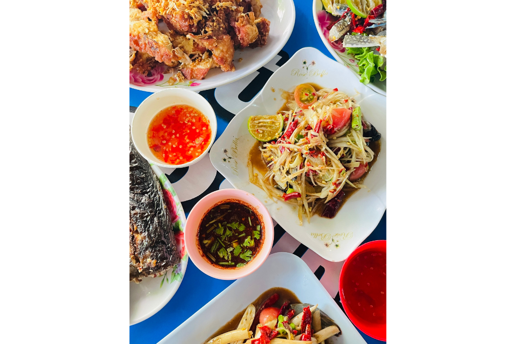 เมนูที่เราประเดิมไปคือ ลาบหมู รสชาติกลมกล่อมมาก ๆ ครบรส เปรี้ยว เผ็ด เค็ม และมีกลิ่นหอมของข้าวคั่วกับใบสะระแหน่ที่โรยมาแบบไม่หวงเครื่อง ตามมาด้วยเมนูตำอย่าง ตำปลาร้า รสชาติจัดจ้านถึงใจสมกับเป็นร้านอีสานแท้ ๆ และ ตำไหลบัวกุ้งสด ที่ไหลบัวกรอบอร่อยมาก และที่ทำให้ว้าวที่สุดคือ กุ้ง ที่ใส่มาในจาน ตัวใหญ่ เนื้อแน่น และสดเด้งสุด ๆ ยิ่งไปกว่านั้นคือเมนู เหลาทะเล ที่ยกทะเลมาไว้บนโต๊ะจริง ๆ ทั้งกุ้ง ปลาหมึก หอย คือทุกอย่างสดมากและตัวใหญ่เกินราคาไปมากเลยค่ะ