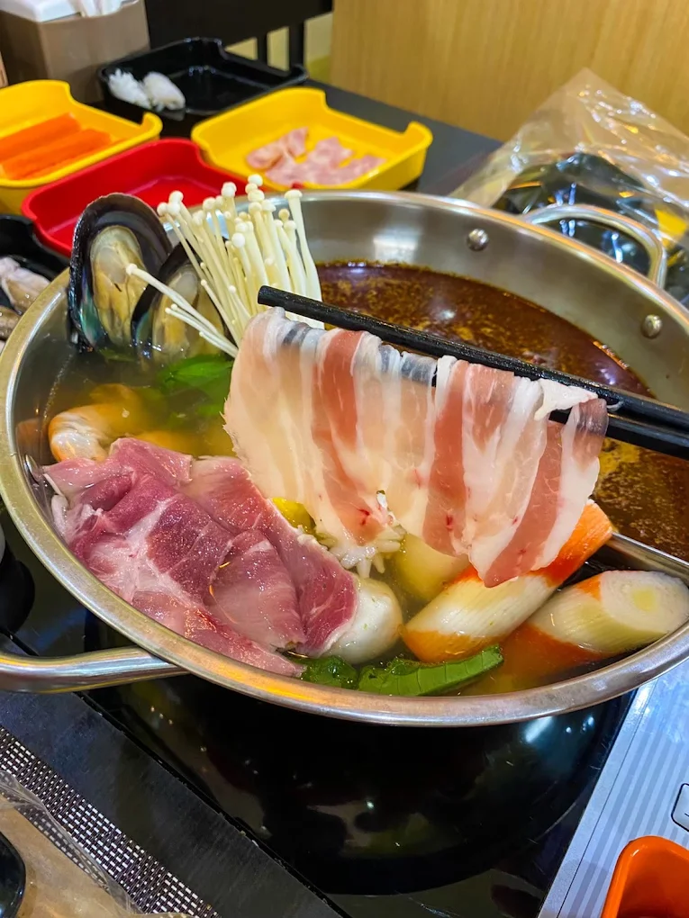 เริ่มที่ ไลน์ชาบู ก่อนเลยค่ะ พวกเนื้อสัตว์นี่คือมีครบทั้งเนื้อวัวสไลด์สวย ๆ, หมูสไลด์นุ่ม ๆ, ไก่, และแน่นอนว่าต้องมี อาหารทะเล สด ๆ ที่จัดมาแบบเต็ม ๆ ทั้งกุ้ง ปลาหมึก หอย คือตักได้แบบไม่อั้นจริง ๆ ค่ะ ส่วนผักสดต่าง ๆ ก็มีให้เลือกเยอะมาก น้ำซุปก็มีให้เลือกหลายแบบ ถูกใจคนชอบชาบูแน่นอน