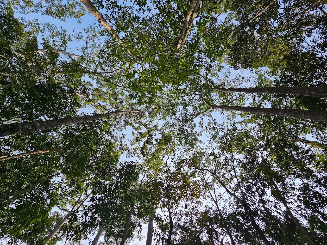 ความตื่นเต้นที่สุดอยู่ตรงกลางเส้นทาง เมื่อเราได้เห็นสิ่งก่อสร้างที่กลมกลืนกับธรรมชาติอย่าง บ้านต้นไม้ ที่เขาไม่ได้ตัดต้นไม้เลย แต่สร้างให้ต้นไม้ทะลุหลังคาขึ้นไป เป็นจุดที่เราสามารถปีนขึ้นไปชมวิวเรือนยอดของป่าดิบชื้นจากมุมสูงได้ ถือเป็นการออกแบบที่เคารพธรรมชาติมาก ๆ และเมื่อเดินลึกเข้าไปอีกไม่นาน เราก็ได้พบกับ ไฮไลต์สำคัญ คือ ต้นยางนาอายุ 200 ปี ที่สูงถึง 42 เมตร และมีเส้นรอบวงถึง 560 เซนติเมตร! การได้ยืนอยู่ข้างต้นไม้ขนาดมหึมาที่อยู่คู่ป่าแห่งนี้มาสองศตวรรษ เป็นความรู้สึกที่น่าทึ่งและทำให้เราเคารพความยิ่งใหญ่ของธรรมชาติอย่างแท้จริง