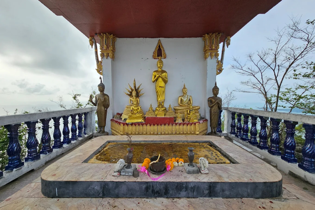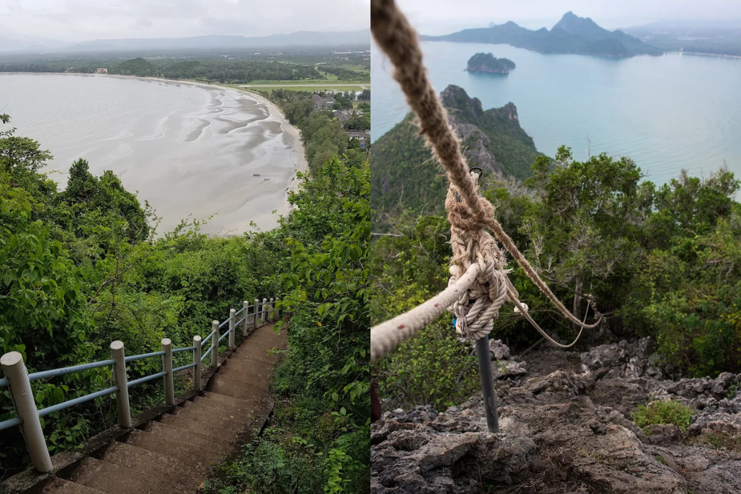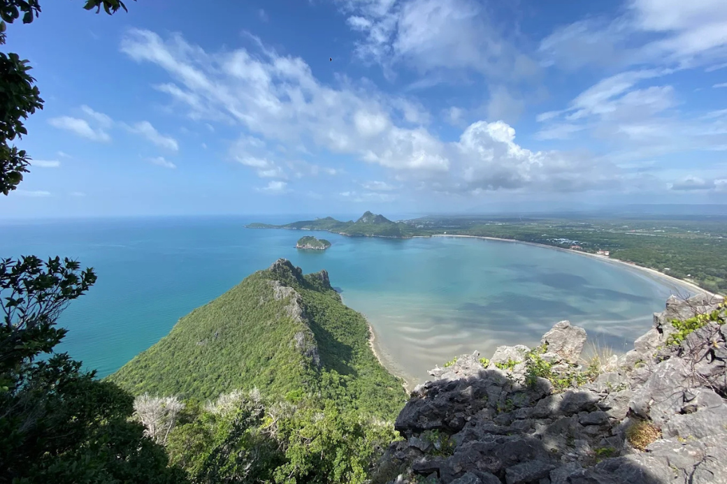 และในที่สุด...วินาทีที่เท้าแตะถึงยอดเขาความเหนื่อยล้าทั้งหมดก็หายไปเป็นปลิดทิ้ง! บนยอดเขาล้อมหมวกซึ่งมีความสูงกว่า 900 ฟุต มี มณฑปประดิษฐานรอยพระพุทธบาทจำลอง ให้เราได้สักการะเพื่อความเป็นสิริมงคล และที่สำคัญคือ วิว 360 องศา ที่เปิดให้เห็นอ่าวทะเลทั้งสามของเมืองประจวบคีรีขันธ์ ได้แก่ อ่าวประจวบ อ่าวน้อย และอ่าวมะนาว มองเห็นผืนน้ำสีฟ้าครามตัดกับสีเขียวของภูเขาได้แบบสุดลูกหูลูกตา เป็นวิวหลักล้านที่ต้องแลกมาด้วยหยาดเหงื่อและกำลังใจทั้งหมดที่เรามี และบอกเลยว่ามัน คุ้มค่า ที่สุดแล้วจริง ๆ ค่ะ! ใครรักการผจญภัยและอยากได้วิวสวย ๆ ที่นี่คือห้ามพลาดเด็ดขาดค่ะ!