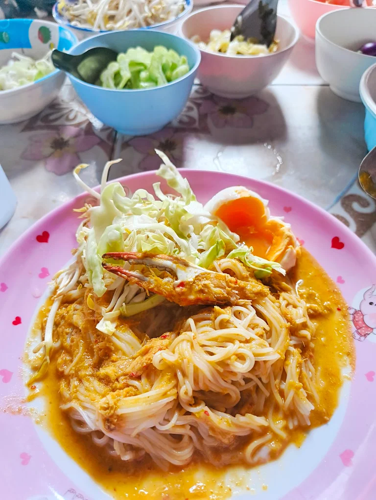 ทีเด็ดที่ทำให้ร้านนี้ครองใจคนท้องถิ่นและนักเดินทางมานาน คือ ความใจป้ำ ในการจัดเตรียมเครื่องเคียงค่ะ! ที่นี่พิสูจน์ให้เห็นว่าผักเคียงหรือ "ผักเหนาะ" นั้นสำคัญไม่แพ้น้ำยาเลย ผักที่นี่ให้มาแบบ จัดเต็มและหลากหลายมาก ๆ ไม่ว่าจะเป็นผักสดที่เราคุ้นเคย หรือจะเป็นผักดองรสชาติกลมกล่อม ที่สำคัญคือมี ปลาเค็มตัวน้อย ๆ ทอดกรอบมาให้ทานเล่นเพลิน ๆ เป็นกิมมิกที่อร่อยลงตัวสุด ๆ