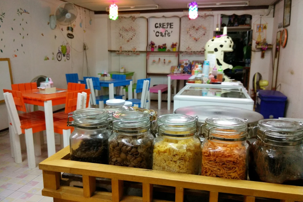 🍽️ ไฮไลต์: เครปหลากหลายชนิด, น้ำแข็งใสเครื่องแน่น, บรรยากาศคาเฟ่