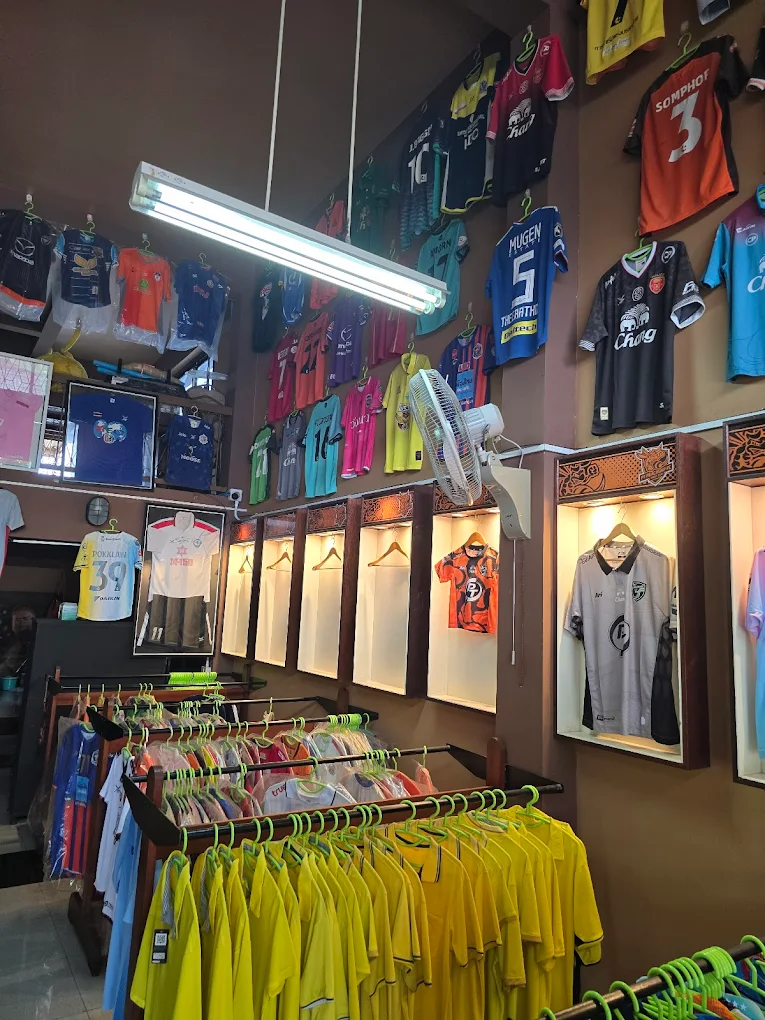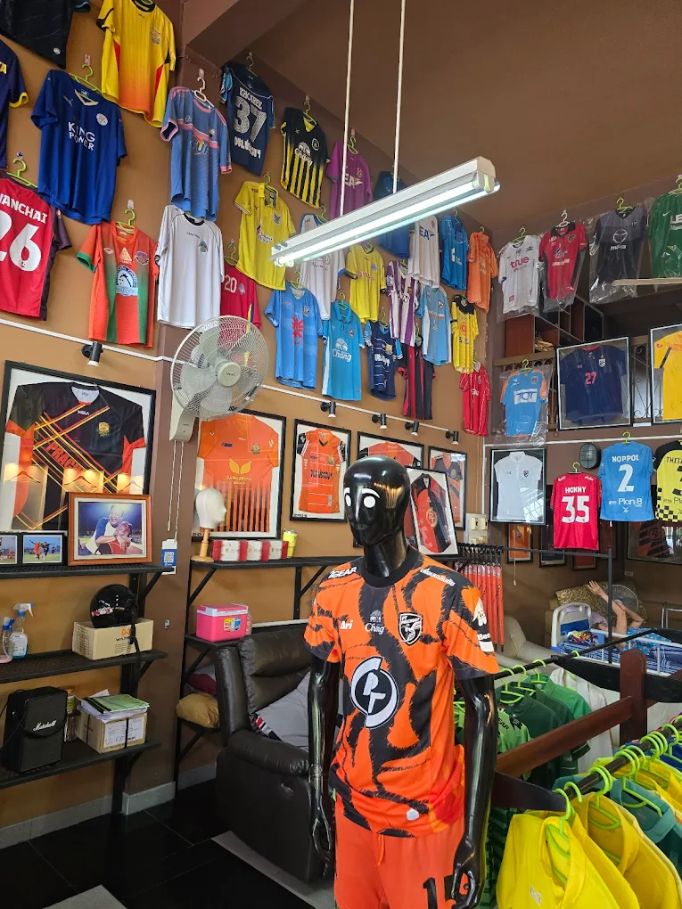 นี่ไม่ใช่แค่ร้านขายเสื้อผ้าทั่วไป แต่เป็นสถานที่ที่รวบรวม จิตวิญญาณของ "ต่อพิฆาต" ไว้ทั้งหมด ทันทีที่ประตูเปิดออก กลิ่นอายของสนามฟุตบอลก็ลอยมาแตะจมูก ผนังทุกด้านเต็มไปด้วยสีส้ม-ดำอันเป็นเอกลักษณ์ เสื้อ Jersey ของฤดูกาลล่าสุดและซีซันก่อน ๆ ถูกจัดเรียงไว้อย่างเป็นระเบียบ รอคอยให้เจ้าของตัวจริงมาหยิบจับและสวมใส่มัน