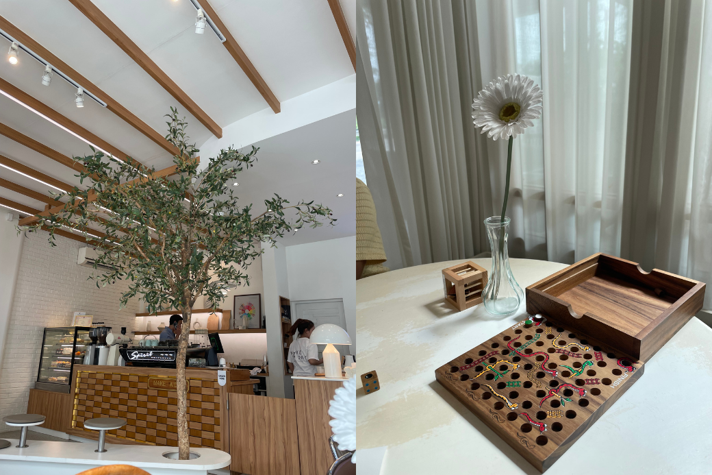 แค่เห็นตัวอาคารสีขาวสะอาดตาตั้งเด่นอยู่ริมถนนก็รู้สึกเย็นตาแล้ว ตัวร้านตกแต่งสไตล์ Minimal Cute ยิ่งมาช่วงปลายปี บรรยากาศ "คริสต์มาส" ที่แต่งแต้มด้วยตุ๊กตาสีแดงและต้นสนสีเขียวก็ยิ่งเพิ่มความอบอุ่นให้กับร้านได้ดีมาก ๆ ภายในร้านโปร่ง สว่าง เน้นความ Homey มีโซนที่นั่งหลากหลายมุม เหมาะแก่การนั่งเอกเขนก มองวิวทิวทัศน์ หรือนั่งทำงานเงียบ ๆ ชิลล์ ๆ จนแทบไม่อยากลุกไปไหนเลยค่ะ รู้สึกได้เลยว่าที่นี่ถูกออกแบบมาเพื่อ "Make A Day" ของเราให้ดีขึ้นจริง ๆ