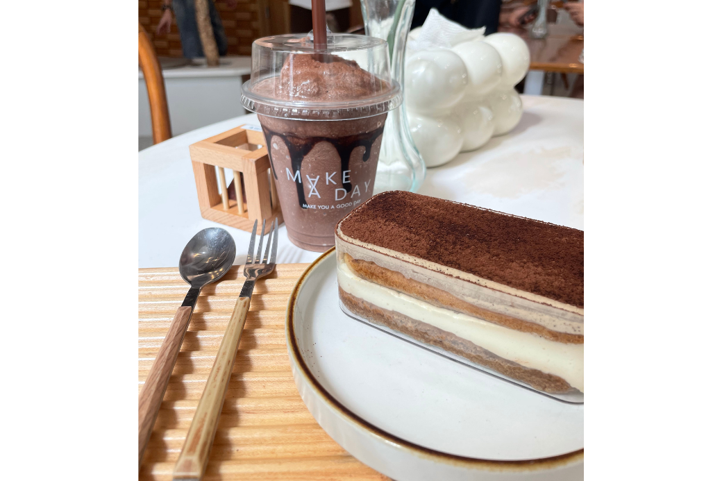 ฉันเลือกสั่งเมนูประจำวันอ่อนเพลียอย่าง "ดาร์คช็อกโกแลตปั่น" และ "ทีรามิสุ" โฮมเมด