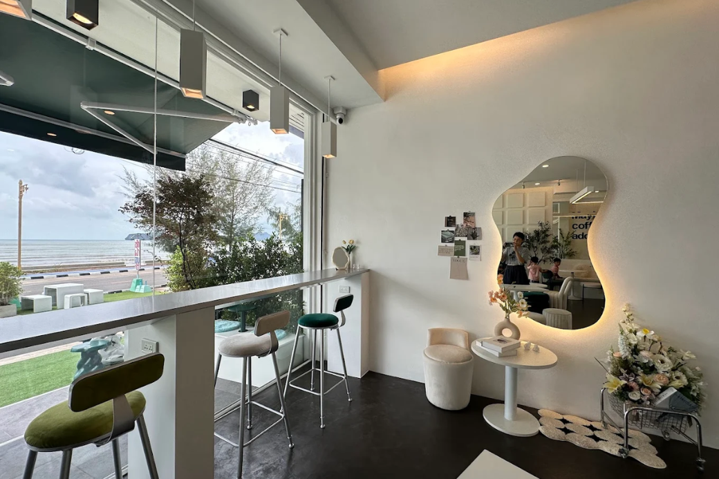 โซนหน้าต่างวิวทะเล: ด้านหน้าร้านจะเป็นกระจกบานใหญ่ มองออกไปเห็นวิวอ่าวประจวบฯ สวยๆ เลยค่ะ นั่งจิบกาแฟไป มองทะเลไป ชิลล์มาก!