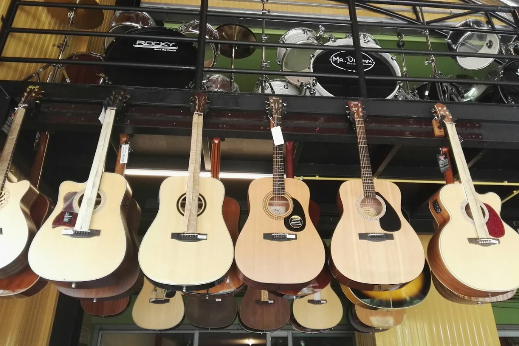 มุมเครื่องดนตรี: ถ่ายภาพชั้นวางกีตาร์ หรืออุปกรณ์ดนตรีอื่นๆ ที่เรียงกันอย่างสวยงาม เพื่อดึงดูดใจคนรักดนตรี