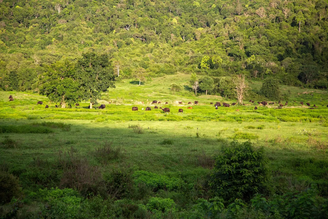 ฝูงกระทิงและวัวแดง! พวกเขาทะยอยเดินออกมาจากป่าแบบโคตรสง่างาม ดูแข็งแรงและดุดันมาก ๆ เราได้แต่เฝ้ามองจากระยะไกลผ่านกล้องและกล้องส่องทางไกล การได้เห็นทั้งกระทิงและวัวแดงมายืนรวมกันแบบนี้ในธรรมชาติแท้ ๆ มันเป็นภาพที่ ทรงพลัง จนต้องยกให้เป็นความทรงจำที่ตราตรึง พอพวกเขาเดินลับเข้าป่าไป เสียงถอนหายใจด้วยความประทับใจก็ดังพร้อมกันทั้งคันรถ