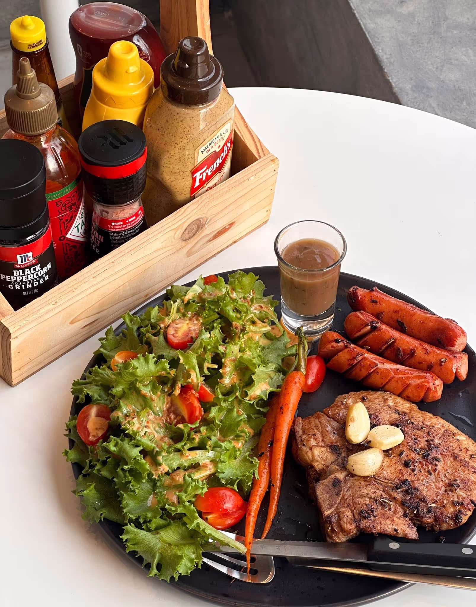 แต่ไฮไลท์ที่แท้จริงคือตอนที่พนักงานนำอาหารจานหลักมาเสิร์ฟ! เราสั่ง สเต๊กจานใหญ่ มาลอง พอเห็นจานเท่านั้นแหละก็ตกใจเลยค่ะ เพราะมัน ใหญ่มาก คุ้มค่าเกินราคาจริง ๆ ตัวสเต๊กทำมาได้ดีมาก เนื้อนุ่มและปรุงรสชาติได้อย่างกลมกล่อม เสิร์ฟพร้อมเครื่องเคียงที่จัดเต็มและหน้าตาน่าทานมาก ๆ ทำให้มื้อนี้ไม่เป็นแค่การมานั่งคาเฟ่จิบเครื่องดื่ม แต่เป็นการมาทานอาหารมื้อหลักที่อร่อยและประทับใจในทุกองค์ประกอบเลยค่ะ