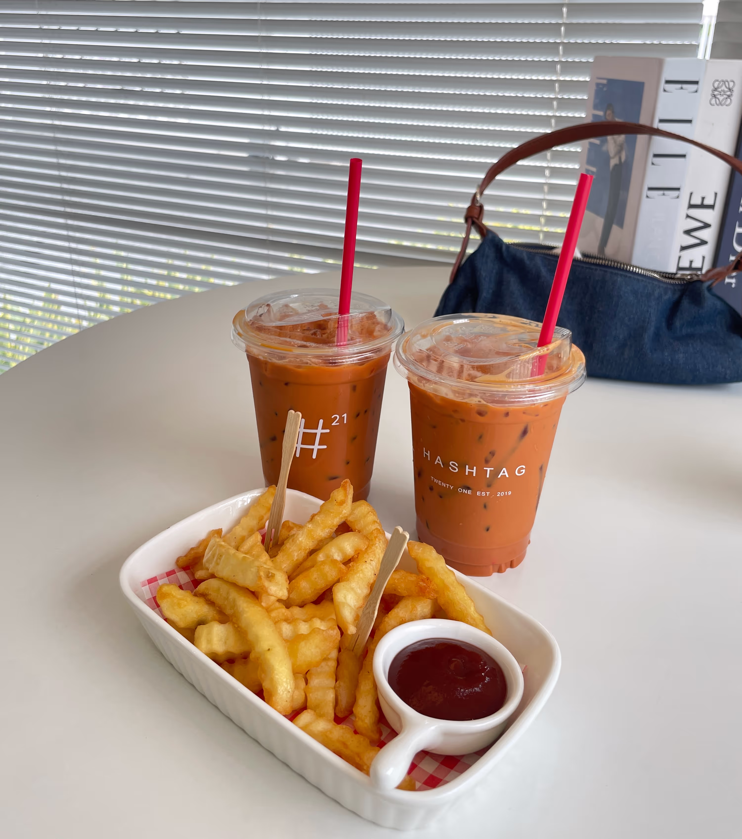 แน่นอนว่าเริ่มจากเครื่องดื่มแก้วโปรด ฉันสั่ง ชาไทยเย็น มาคนละแก้วกับเพื่อน ชาไทยที่นี่ทำได้เข้มข้นถึงรสชาติมากค่ะ หอมกลิ่นชาแบบไทย ๆ หวานกำลังพอดี ดื่มแล้วรู้สึกสดชื่นและตื่นตัวขึ้นมาทันที ส่วนของทานเล่นเบา ๆ เราสั่ง เฟรนช์ฟรายทอด มาทานคู่กัน ทอดมากรอบนอกนุ่มใน เค็มกำลังดี เป็นของทานเล่นเรียกน้ำย่อยที่เพลินมากค่ะ