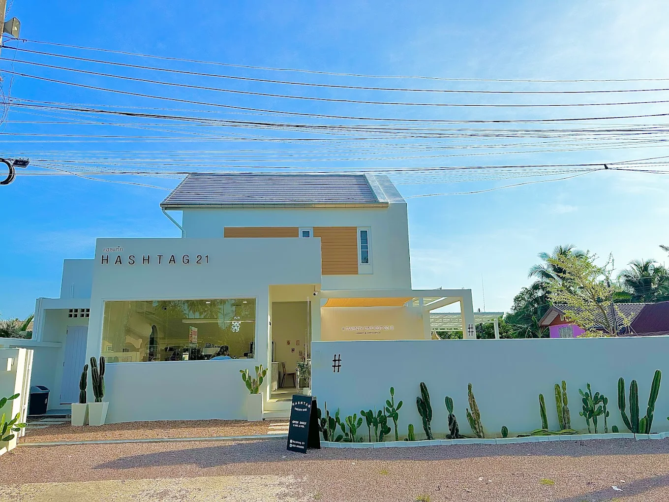การเดินทางมาถึงทับสะแกครั้งนี้ สิ่งที่พลาดไม่ได้เลยคือการแวะเช็กอินที่คาเฟ่เก๋ ๆ ซึ่งฉันเลือกปักหมุดที่ Hashtag 21 (แฮชแท็ก 21) ทันทีที่มาถึงก็รู้สึกว้าวกับสไตล์การออกแบบของร้าน ตัวอาคารเป็นตึกสีขาวสะอาดตา ตัดกับท้องฟ้าอย่างลงตัว ตกแต่งแบบมินิมอลแต่เต็มไปด้วยดีเทลน่ารัก ๆ ที่ถูกจัดวางไว้อย่างตั้งใจทุกมุม ทำให้ฉันรู้เลยว่า ที่นี่แหละคือสวรรค์ของสายถ่ายรูป! มุมถ่ายรูปของเขามีเยอะมากจริง ๆ ค่ะ ไม่ว่าจะเป็นกำแพงขาวเรียบ ๆ ที่มีเงาตกกระทบสวย ๆ หรือมุมนั่งเล่นที่มีพร็อพน่ารัก ๆ ให้เราแชะภาพได้แบบเพลิน ๆ จนแทบจะลืมสั่งเครื่องดื่มไปเลย
