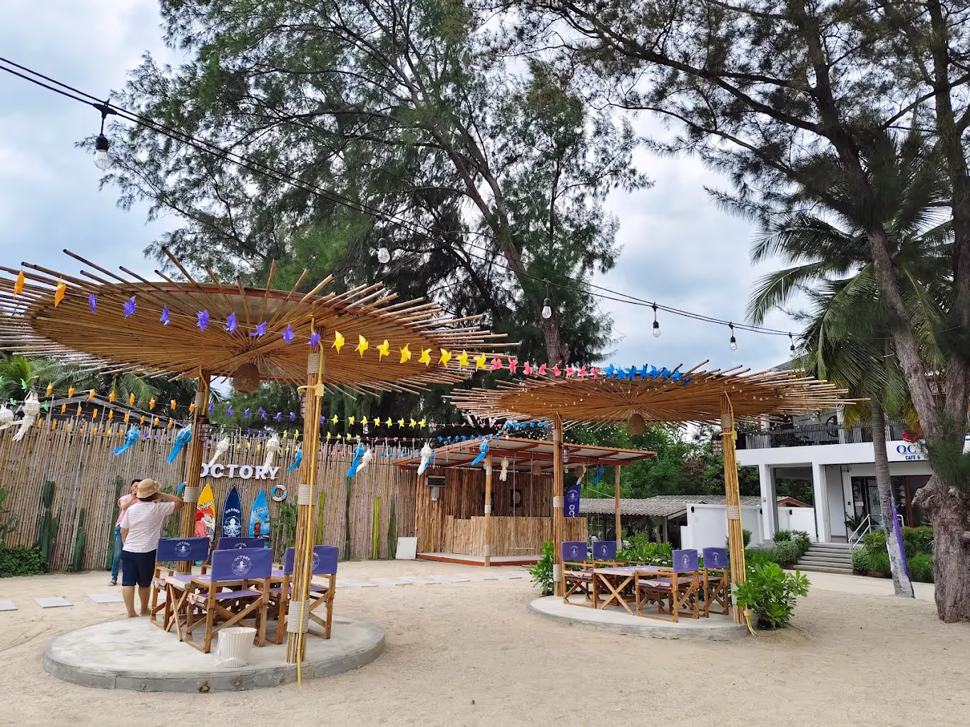 แต่ไฮไลท์ที่ดึงดูดฉันไว้ได้อย่างหมดจดคือ โซน Outdoor ริมทะเล ที่จัดแต่งเป็นลานกว้างยื่นออกไปรับลมทะเลแบบเต็มผืน มีที่นั่งสไตล์ บังกะโล ไม้เล็ก ๆ กระจายตัวอยู่ใต้ร่มเงาให้ความรู้สึกเป็นส่วนตัว ฉันไม่รอช้า รีบเลือกมุมที่นั่งที่สามารถยื่นเท้าเกือบจะสัมผัสผืนทราย และปล่อยให้เสียงคลื่นที่ซัดเข้าฝั่งเป็นดนตรีคลอเบา ๆ ตลอดช่วงเวลาพักผ่อน เป็นบรรยากาศที่ให้ความรู้สึกผ่อนคลายระดับสิบ จนแทบไม่อยากลุกไปไหนเลยทีเดียว